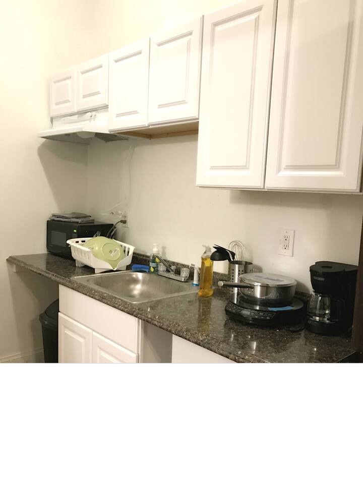 The kitchenette offers a electrical hot plate, a microwave, a compact fridge, a coffee maker, and a sink. No stove/oven. Portable A/C unit will be unplugged and removed away from the window during late fall/winter when outside temperature is below 60 F.