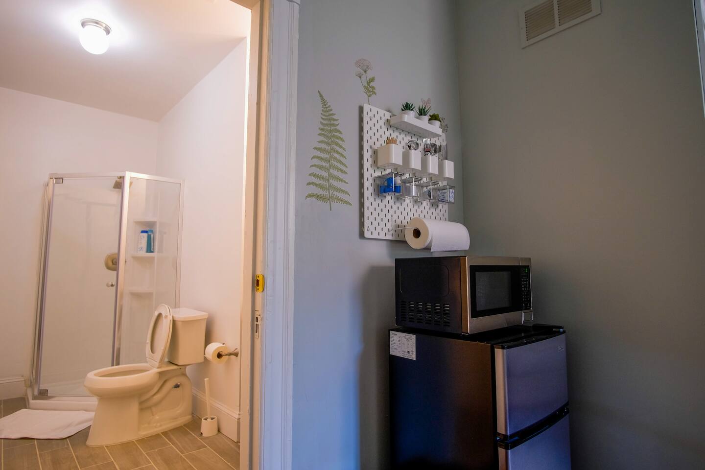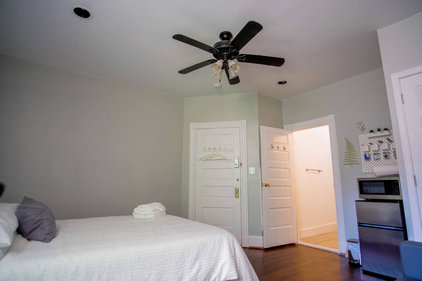 This is a lovely studio with private bathroom. In addition to all the basics, we also supply iron and board. No kitchen, yet we do provide mini fridge, microwave, coffee machine and water boiler