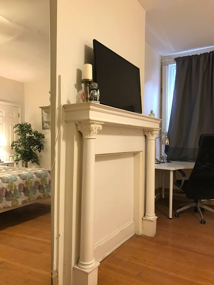 Large studio apartment with private bathroom in a beautiful and spacious 3-level townhouse. The studio features queen size bed with memory foam mattress, lovely living area with smart TV, laptop-friendly work station with office chair, newly upgraded private bathroom, and kitchenette with (ONLY) microwave and mini fridge.