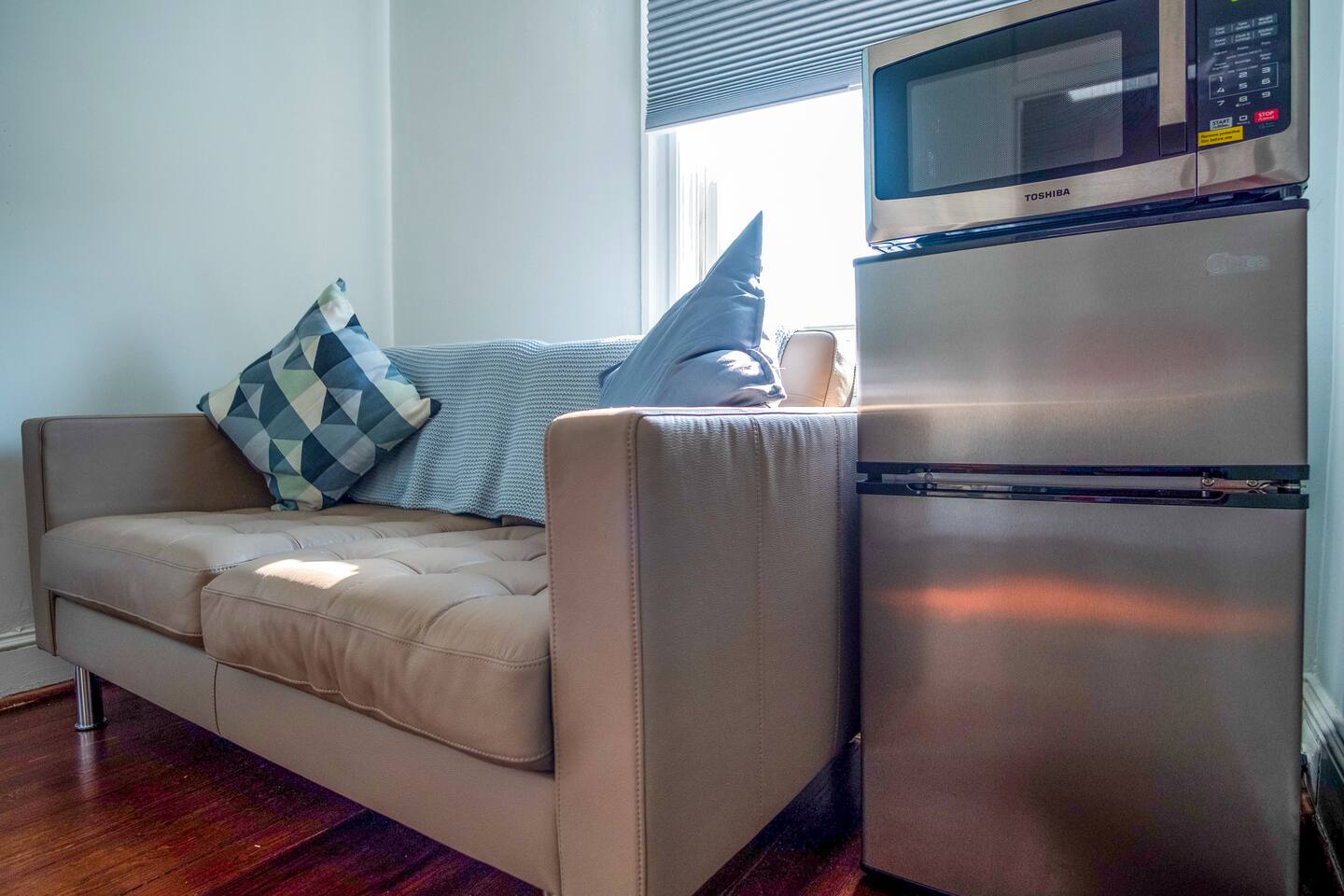 This is a spacious studio with private bathroom. On top of all the basics, we also supply iron and board. No kitchen, yet we do provide mini fridge, microwave, coffee machine and water boiler