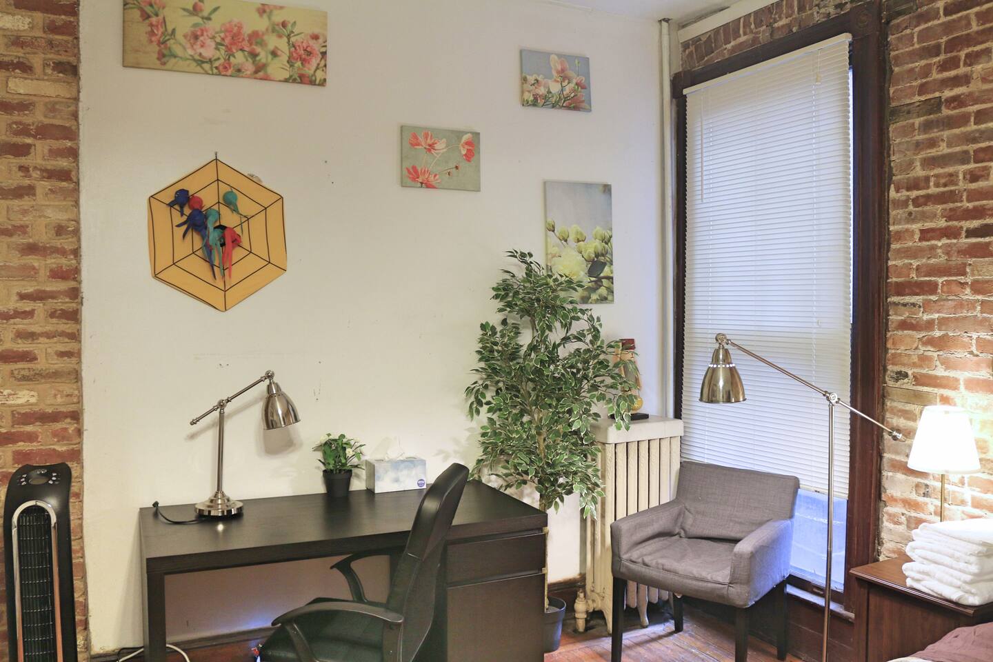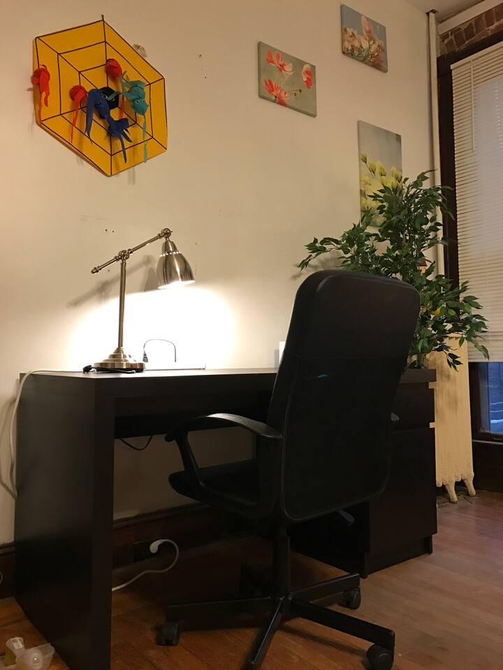 Comfy studio apartment with private bathroom in a beautiful and spacious 3-level townhouse. The studio features a queen size bed with memory foam mattress and a laptop-friendly work station with office chair, large private closet, mini kitchenette with (ONLY) microwave and compact fridge, and private full bathroom.