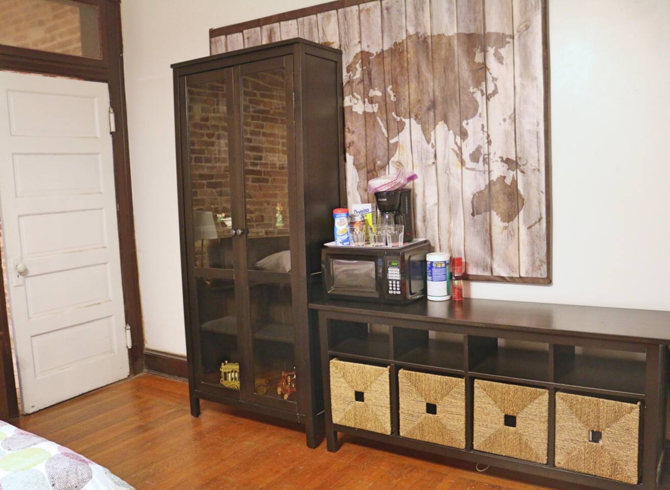 1 large studio 1 private full bathroom Mini Kitchenette with (ONLY) microwave and compact fridge Washer and dryer (basement level)